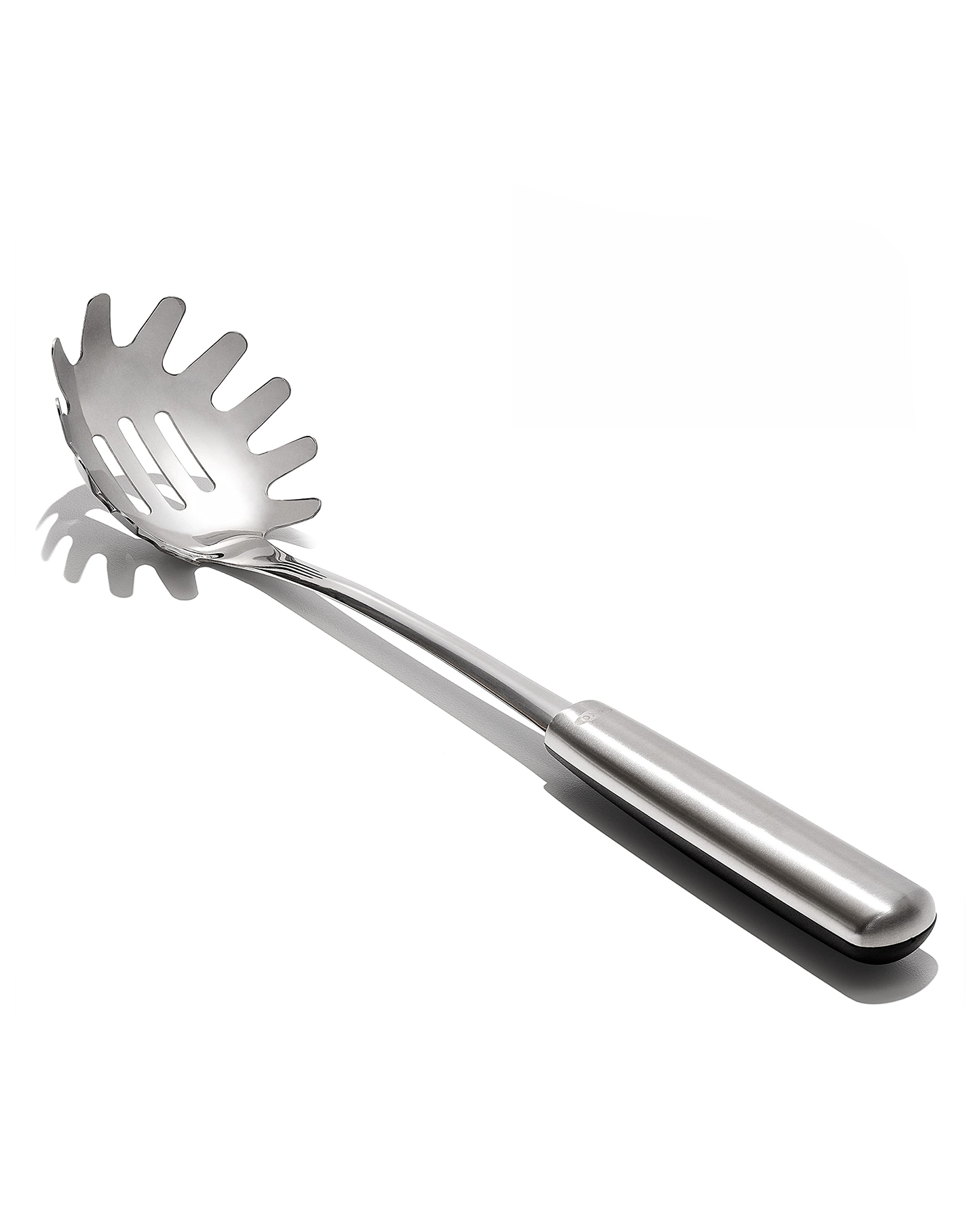 Tyylikäs teräksinen pastakauha. Kädensija terästä ja silikonia.