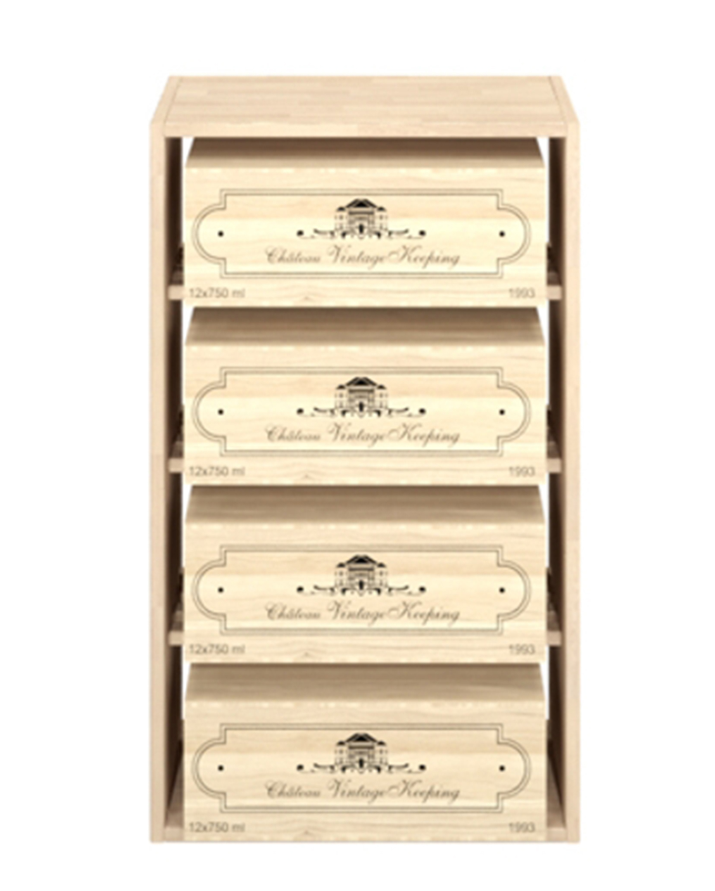 Yksinkertainen viinipullohyllymoduli, johon mahtuu 4 isoa 12 pullon viinipullolaatikkoa. Sopii käytettäväksi erillisenä tai osana isompaa Qbic-viinihyllykokonaisuutta.