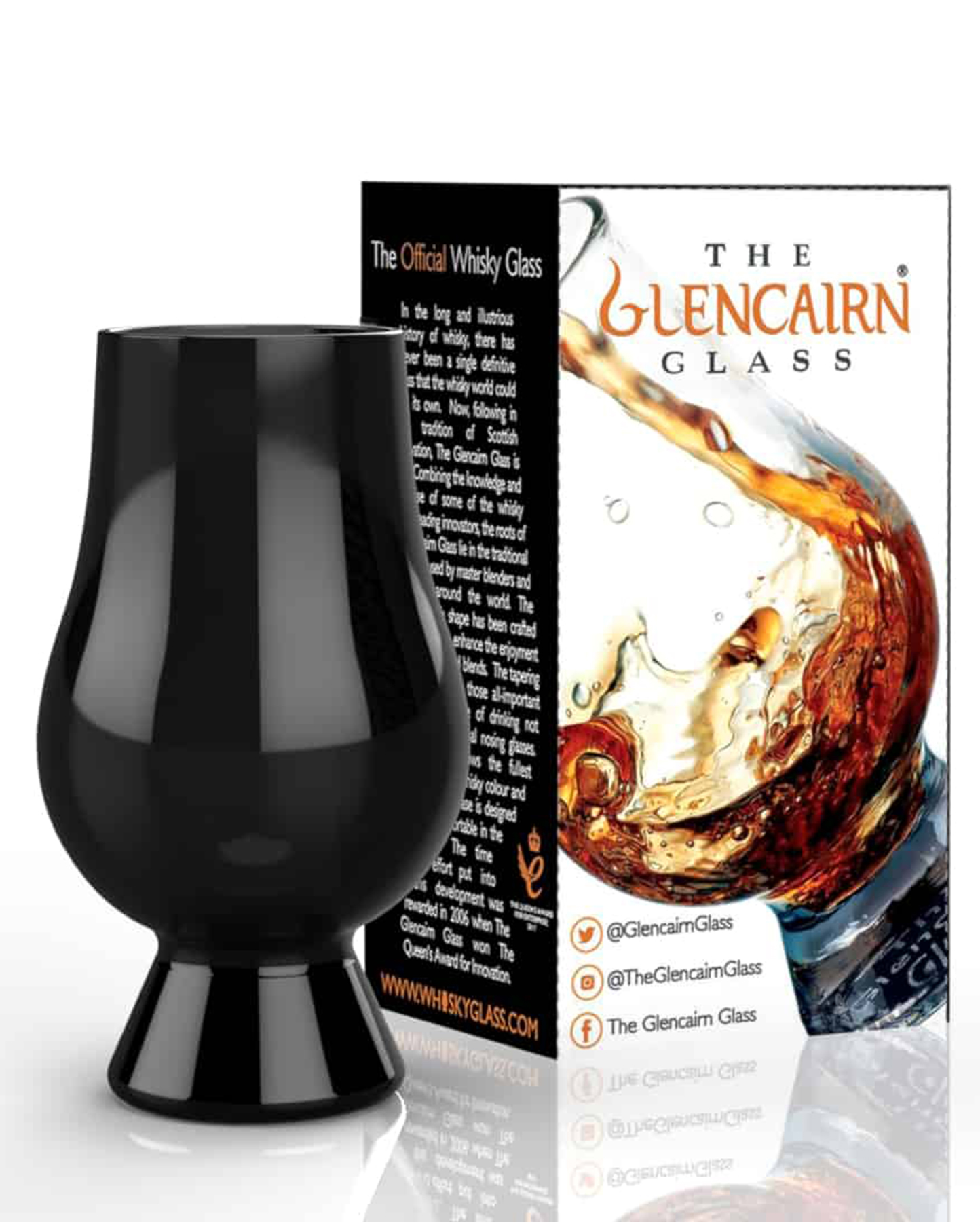 Klassisen skotlantilaisen Glencairn-viskilasin uusi musta sokkomaistelulasi, jossa viskin väri ei pääse vaikuttamaan maisteluun.