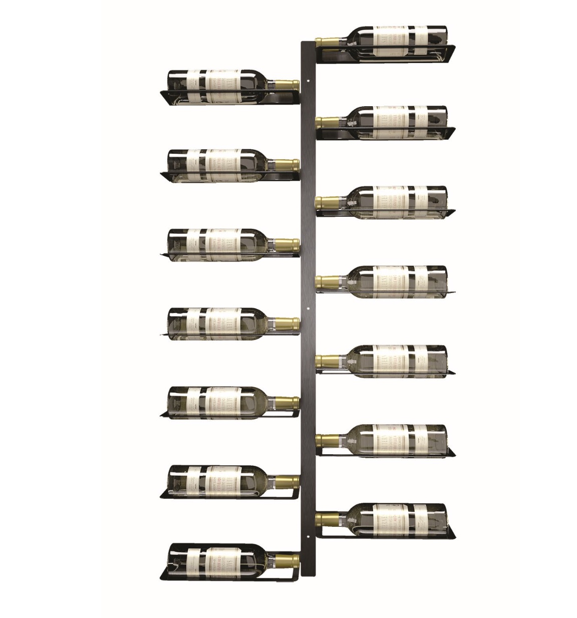 Stilrent, modernt vägghängt stålfärgat vinställ för 14 flaskor.